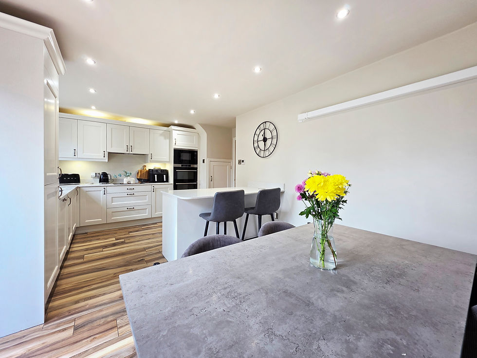 Immaculately presented throughout, the home features a cosy living room and a striking open-plan dining kitchen, perfect for modern family life and entertaining. The current owners have enhanced the property with quality finishes, including air conditioning units installed in three rooms.